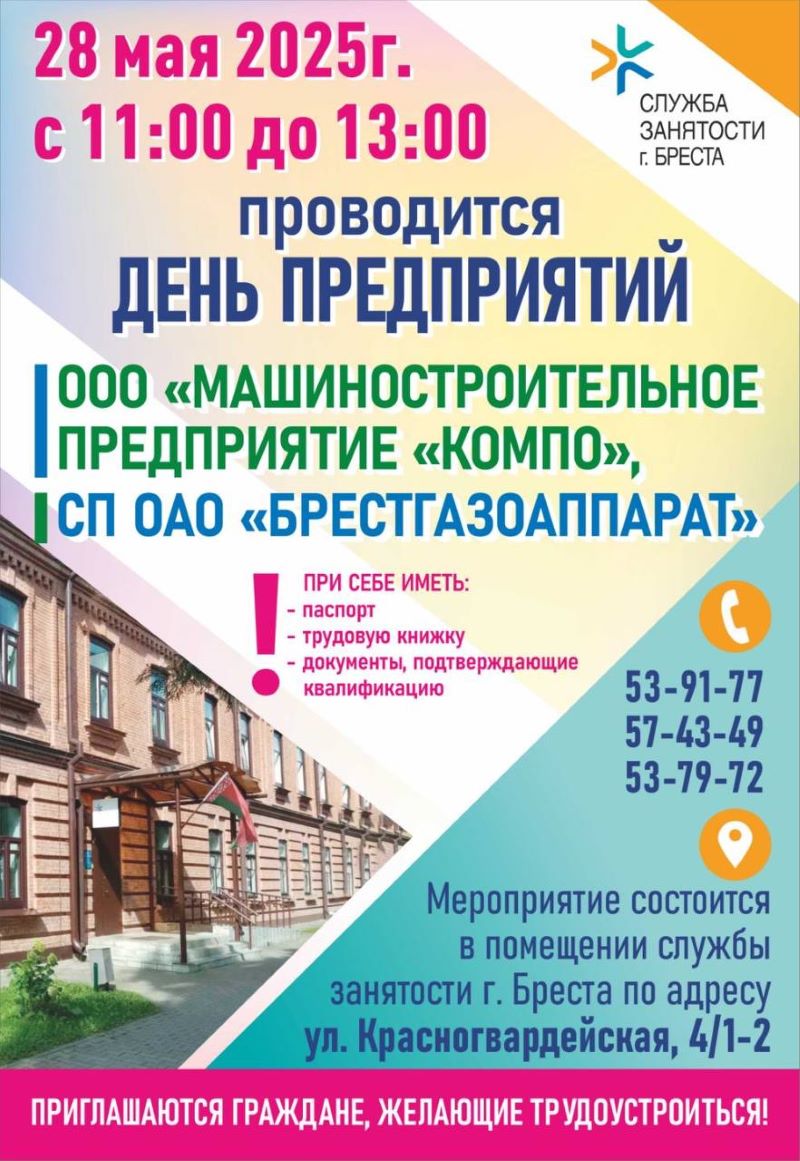 28 мая в Бресте пройдет День предприятий, организованный управлением по труду, занятости и социальной защите Брестского горисполкома. На мероприятии будут представлены вакансии от ООО «Машиностроительное предприятие «КОМПО» и СП ОАО «Брестгазоаппарат».