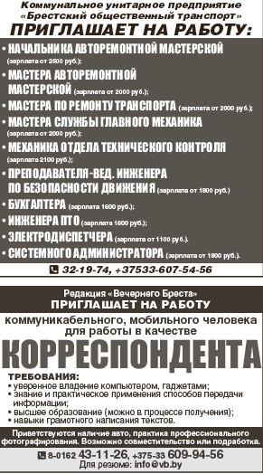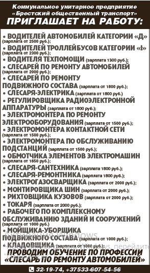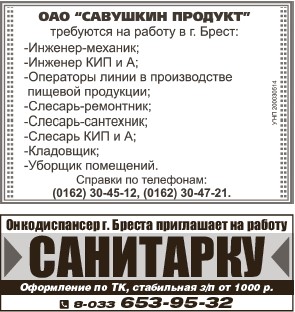 требуется на погрузчик работник с навыками сварщика, ночной сторож, истопник. Т. 8-029-206-21-63.