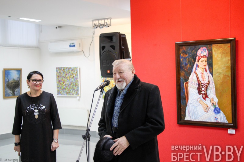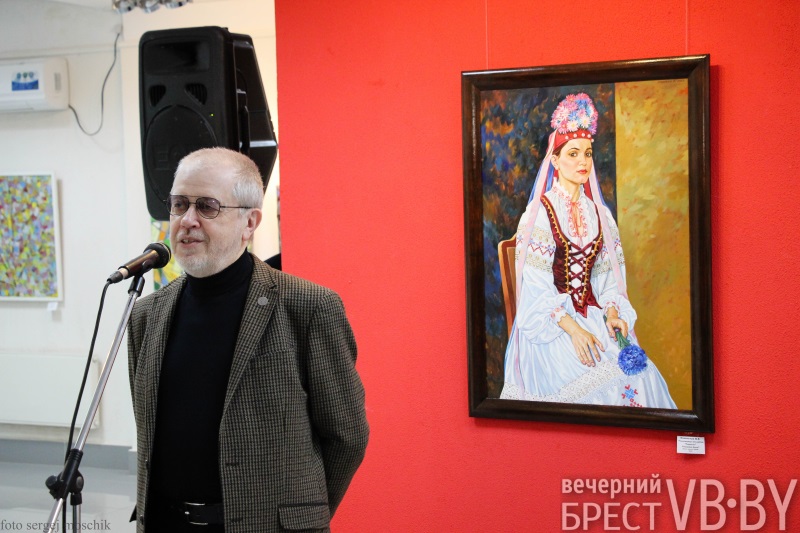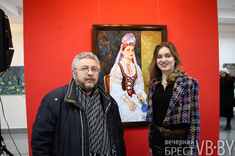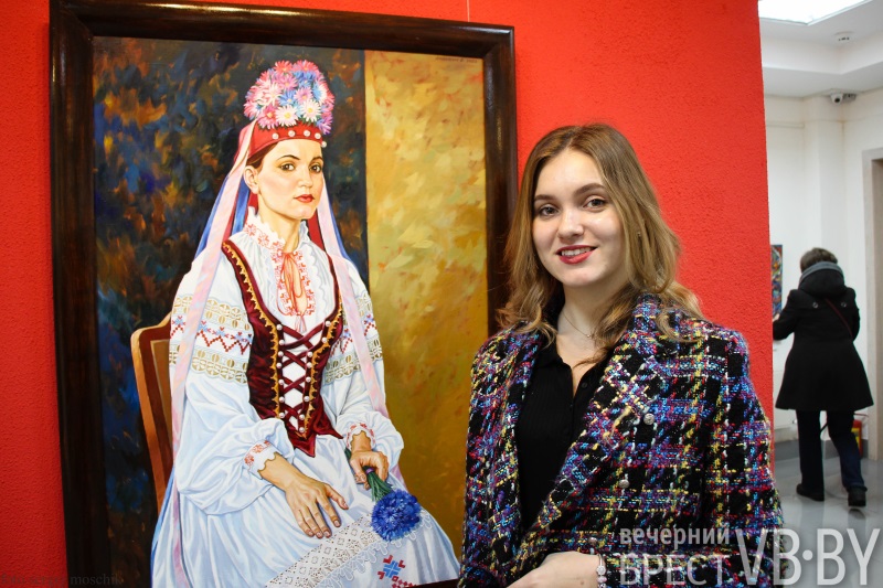 С самого начала многих интересовало, что представлено на главной красной стене? Ответ оказался неожиданным: работа Валерия Ковальчука «Танцовщица ансамбля «Радасць» Анна Росалюк». Причем, сама натурщица присутствовала в зале. Автор – старший преподаватель БрГТУ В. Ковальчук рассказал, что старался создать образ «беларусачкі», а через богатый национальный костюм передать народный дух и традиции. Сама Анна является студенткой названного вуза, шесть лет выступает в заслуженном любительском коллективе Республики Беларусь ансамбле танца «Радость». В названном костюме артисты исполняют танец «Перепелочка». По словам художника, ему очень интересно писать портреты, за время работы и общения будто прикасаешься к душе человека.