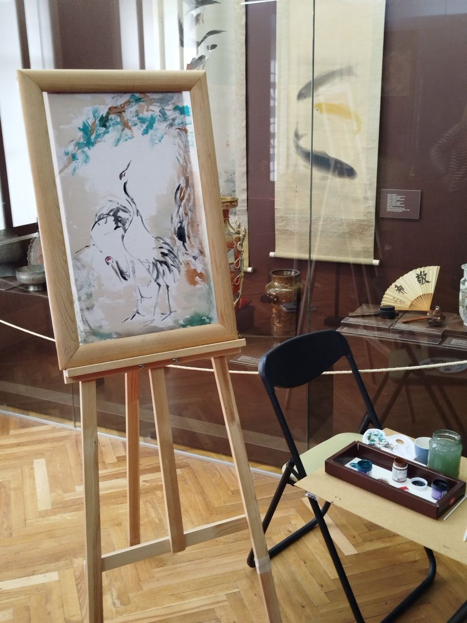 А также важной частью мероприятия стал мастер-класс по созданию картины в технике росписи на ткани. На готовой картине – два журавля – древние символы весны. Рядом с птицами изображена сосна, которая ассоциируется у людей разных культур с долгой и стабильной жизнью.