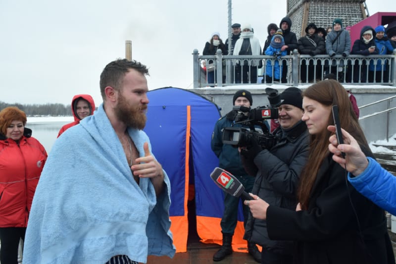 Всем известно, что «моржи» перед заплывом должны находиться на теплой платформе. На «Брэсцкiх забавах» ее роль выполняла настоящая красная дорожка. Перед заплывом зарегистрированных «моржей» ведущий обратился к гуляющим брестчанам: может, кто желает окунуться? Казалось, странный вопрос: кто разденется посредине зимы, если он не «морж»? Но такие люди нашлись. Сначала, чтобы переодеться, в палатку нырнул смельчак Даниил, а за ним испытать себя вызвался другой красавец – Влад. Надо сказать, все службы, которые несли ответственность за заплыв – «Скорая помощь», ОСВОД… – заметно напряглись. Наготове встали водолазы в черных спецкостюмах.