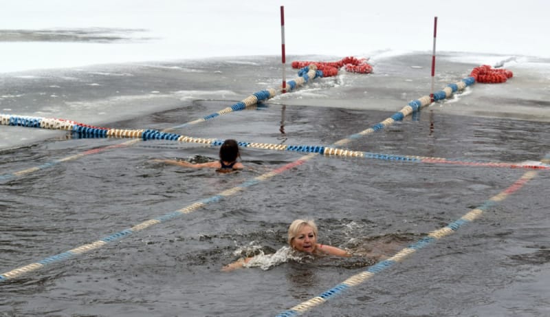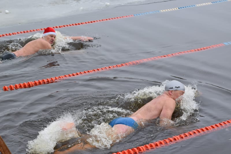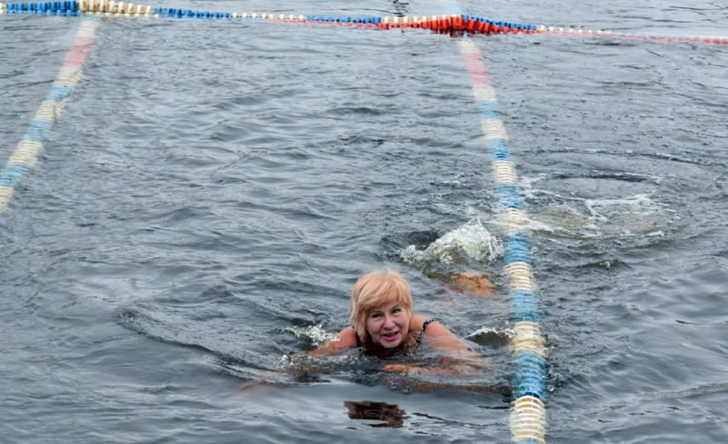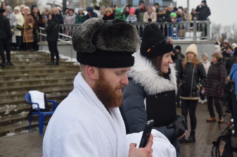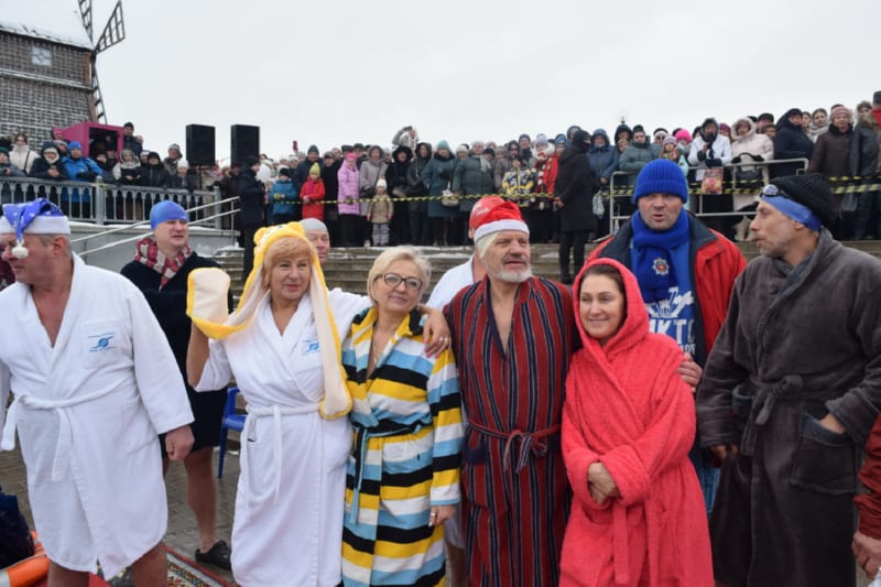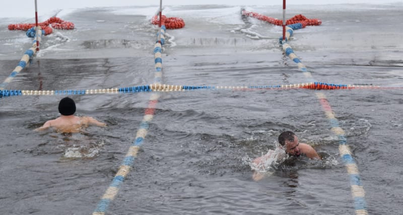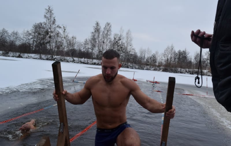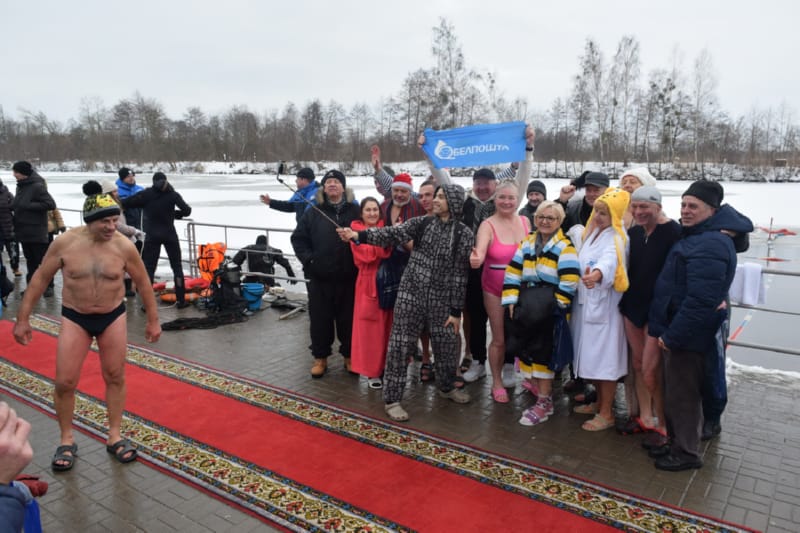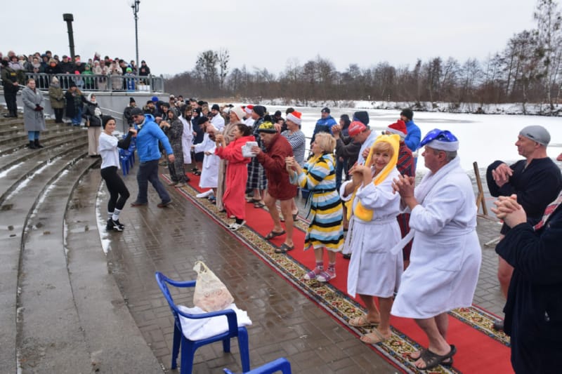 И, наконец, на красную дорожку вышли около 20 настоящих любителей зимнего плавания – в халатах, некоторые в смешных колпачках и шапках с ушами (наверное, это часть костюма «моржей»). В числе любителей особенно выделялись три красивые, с прическами, женщины. Ведущий торжественно произнес: «Не все герои носят плащи, некоторые герои носят плавки!» Посмеялись, разминка «моржей» под хеви-металл, и пошли заплывать на 25 метров (туда и обратно). Температура воды в Мухавце сегодня, 13 января, установилась на 4 градусах выше ноля. Дрожь бежала по телу, когда «моржи» опускались в полынью, вырубленную во льду.
