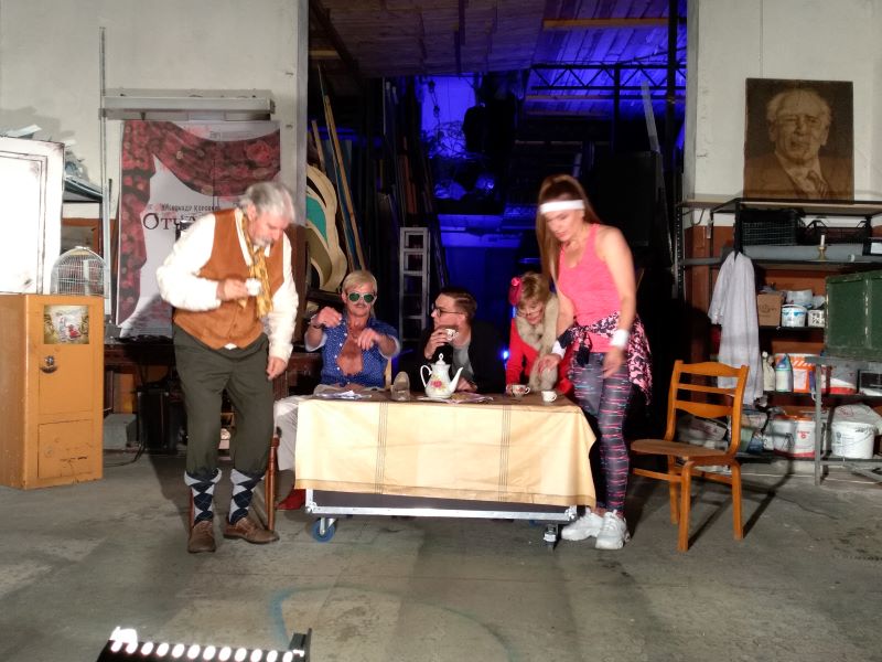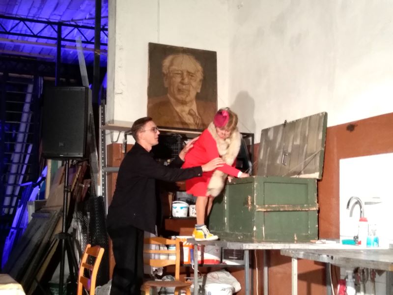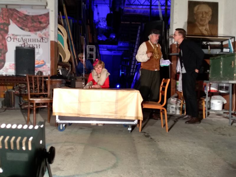 Наиболее красноречиво в своем лабораторном происхождении выглядел отрывок из Мрожека. Его просматривали в помещении производственных мастерских, где артистическое действо вполне органично соседствовало с обстановкой столярно-монтировочного цеха. Натуральная неказистость интерьера отлично перекликалась с заявленной в пьесе безалаберностью действующих лиц.