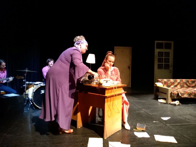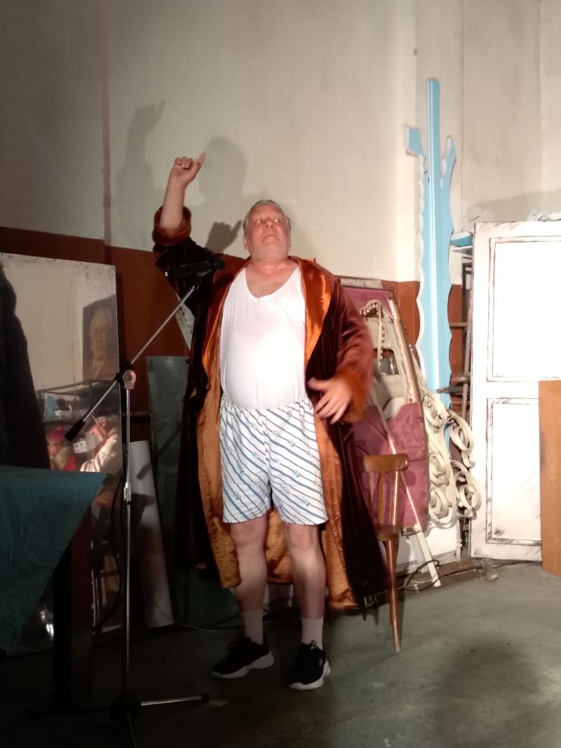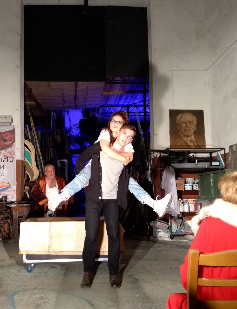Зарисовки из Эдварда Радзинского давались на сцене большого зала, там же разместилась и наша зрительская компания. Эпатажная конструкция пьесы дает режиссеру благодатную почву для самовыражения, чем постановщица Виктория и воспользовалась достаточно успешно. Одно время спектакль по этой пьесе шел на сцене брестского театра. В нем завораживающе богемно смотрелась исполнительница роли юной бунтовщицы Татьяна Виноградова. В нынешнем варианте сыгранный студенткой Натальей Сандриковой образ оригиналки не столь утонченный, зато более реалистичный. Именно так может выглядеть угловатая особа, бесконечно запивающая свою нервозность холодной водой и воспринимающая любовь как битву на рапирах.