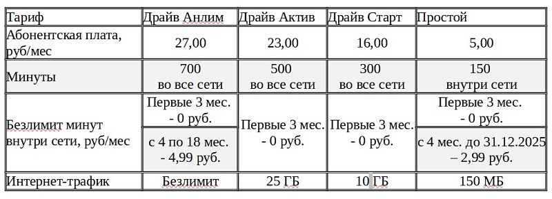 И это еще не все: по истечении трех месяцев в зависимости от выбранного тарифного плана новые абоненты линейки «Драйв» смогут продолжать пользоваться пакетом «Безлимит минут внутри сети» с существенными скидками. Подробности – в таблице ниже: