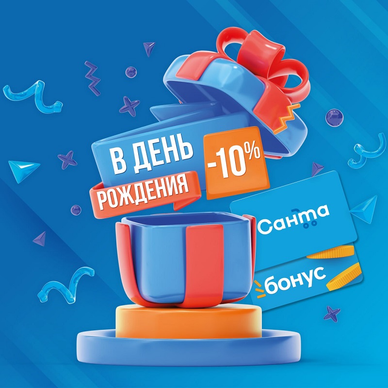 Новый год и Рождество – не единственное время для подарков. «Санта» помнит и о Вашем дне рождения. Теперь к празднику, когда поздравления сыплются от родных, коллег и друзей, не лишним будет сходит за вкусными угощениями в «любимый магазин», где «добрый день» давно стало привычным. В день рождения, кроме душевных пожеланий, торговая сеть подарит персональную скидку 10 % на один чек. Как ею воспользоваться? Просто отсканируйте на кассе скидочный купон (доступен в личном кабинете в разделе «Мои акции») и карту «Санта Бонус» – и ваша скидка активируется. Предложение от «Санты» действительно в день рождения и еще в течение трех дней до и после замечательной даты.