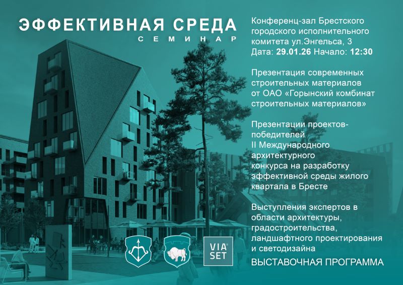 29 января 2026 года в конференц-зале Брестского городского исполнительного комитета (г. Брест, ул. Энгельса, 3) состоится семинар «Эффективная среда», направленный на обсуждение актуальных подходов к формированию жилых территорий и общественных пространств в современных условиях. Начало регистрации в 12:30.