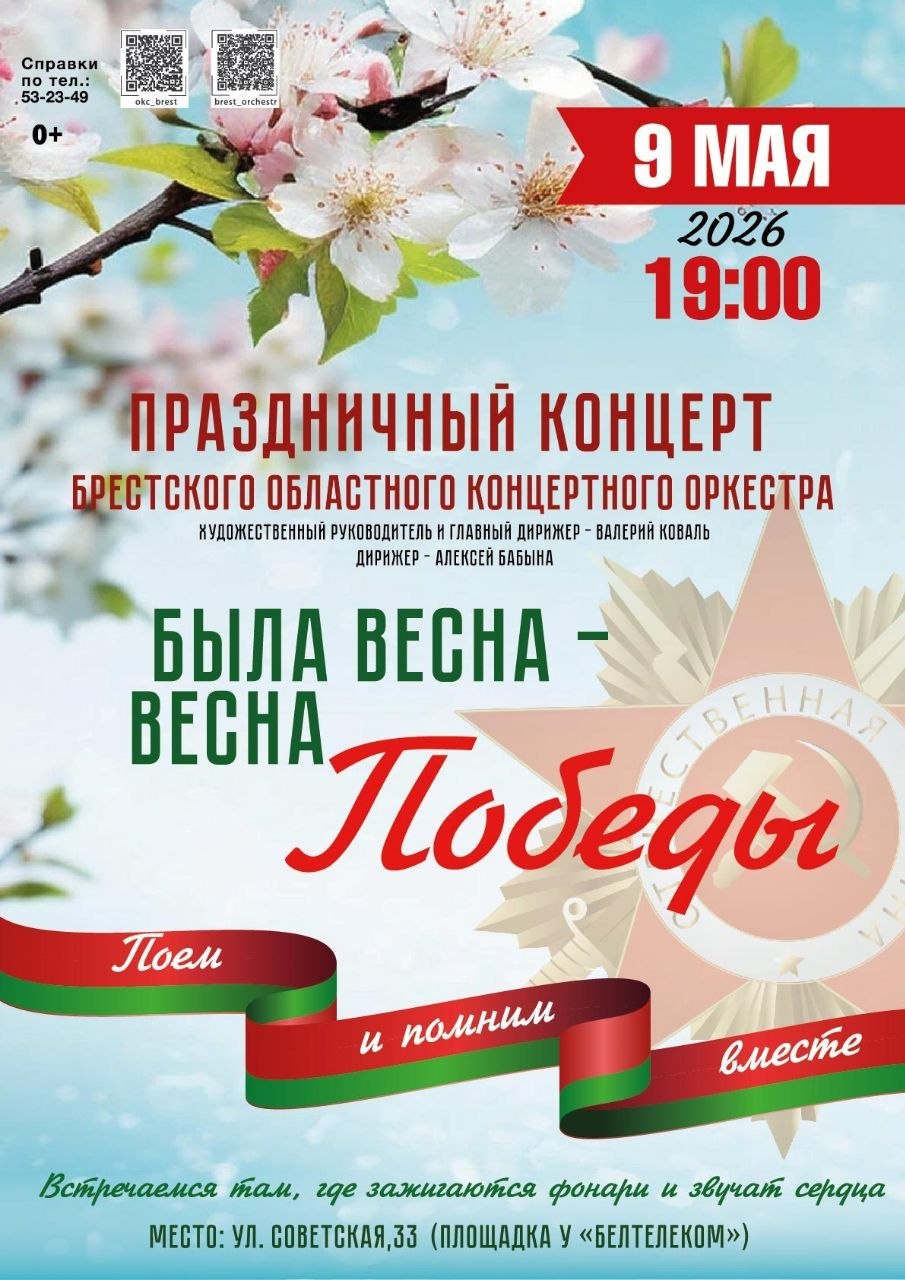 Брестский областной концертный оркестр под управлением Валерия Коваля и Алексея Бобыны 9 мая в 19:00 приглашает на праздничный концерт, который состоится на площадке у здания Белтелекома на ул. Советской, 33.
