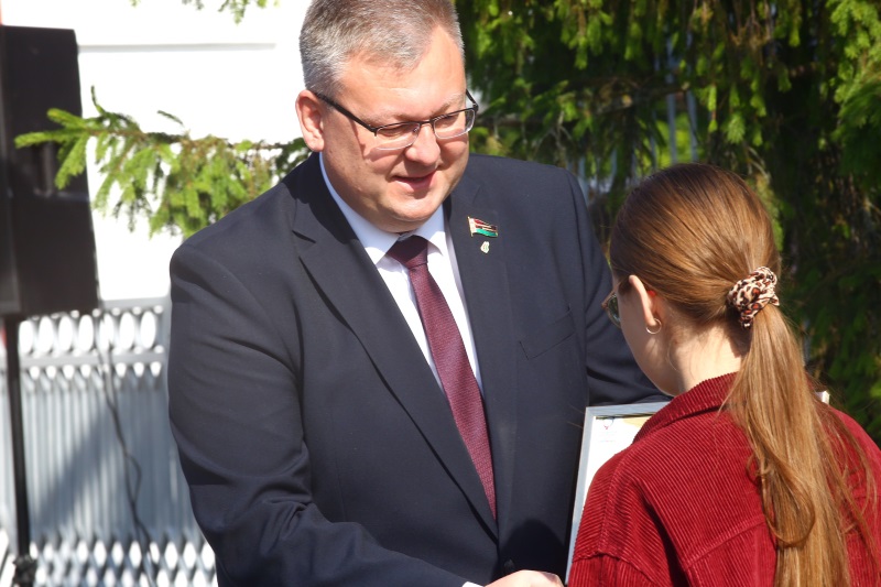 Кроме того, Игорь Брилевич вручил приз и памятный подарок победителю республиканского фотоконкурса «Символ памяти». Организатор конкурса – Республиканский волонтерский центр учреждения образования «Республиканский центр высшей школы». В этот раз победителем стала брестчанка Ксения Едунова, студентка Брестского государственного технического университета.