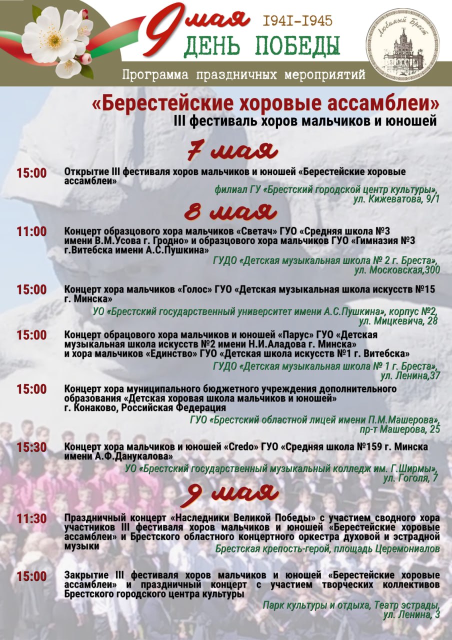 Продолжаем делиться афишей ко Дню Победы. С 7 по 9 мая Брест превратится в хоровую столицу — к нам возвращается фестиваль хоров мальчиков и юношей.