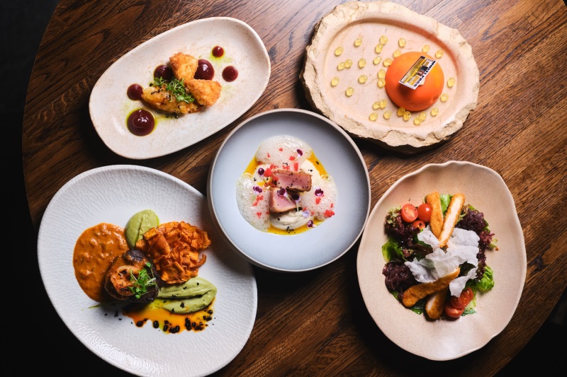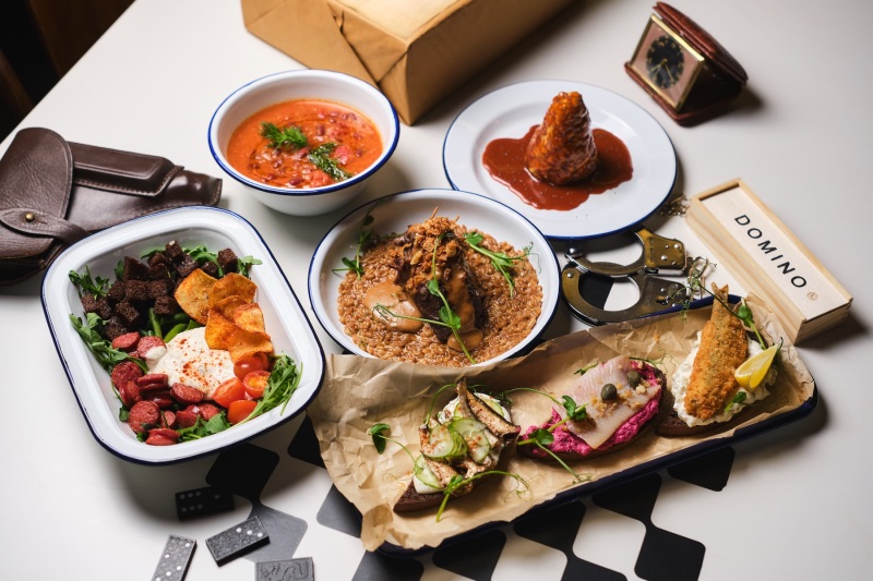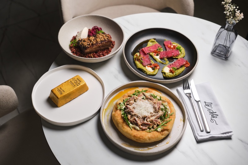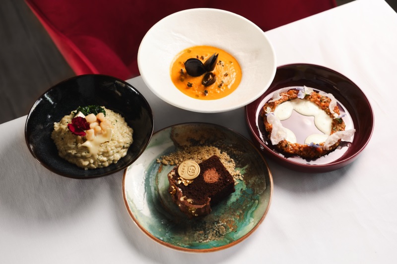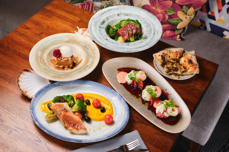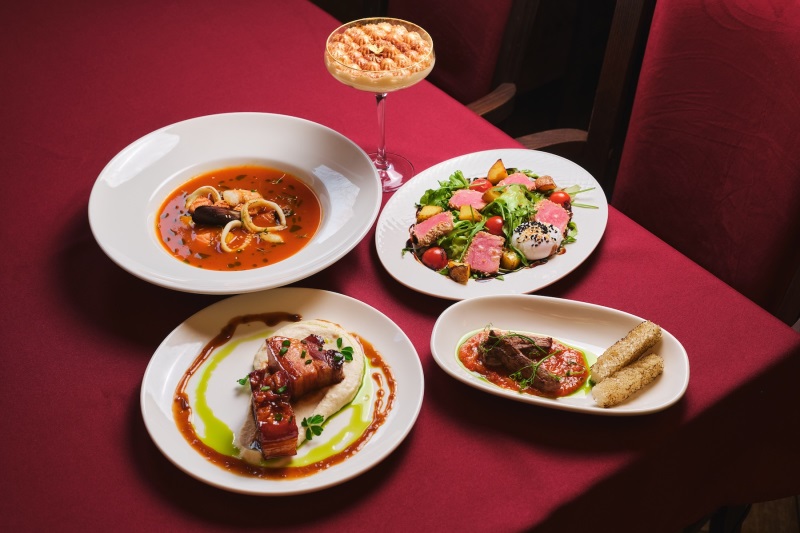 - Закуска «Антипасти Портороссо» (сливочный мусс из рикотты, дополненный ярким ассорти из маринованного личи и чили, а также кислинкой томатного рыбного соуса. Подается с ягодным луком и домашней фокаччей)