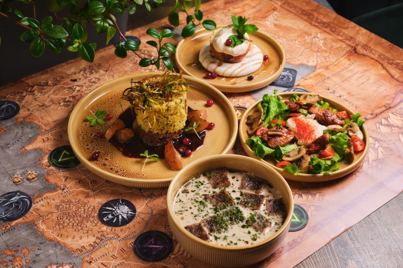 - Салат «Темерия» (салат с курицей гриль в пивном маринаде с жареными грибами, зеленью, яйцом пашот и фирменной заправкой)