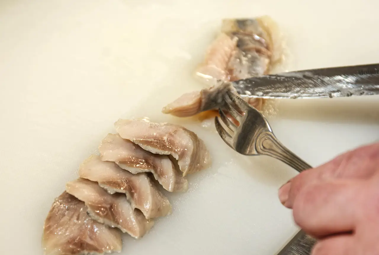 Шеф-повар показывает свой способ нарезки сельди: филе выкладываем на разделочную доску, вилкой сверху слегка придерживаем филе и наискось нарезаем ломтик за ломтиком. Как говорит Илья Майсак, японские мастера всегда нарезают свежую рыбу под острым углом, чтобы можно было отвернуть кусочек и полюбоваться структурой рыбы.