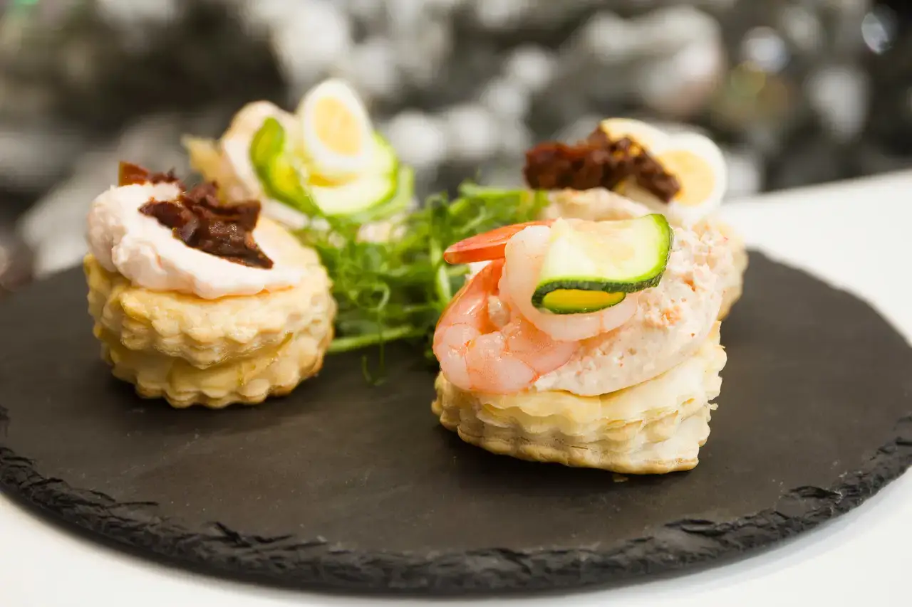 В остывших квадратиках или кружочках слоеного теста аккуратно чайной ложечкой делаем небольшое углубление – для удобства выкладки ингредиентов. На часть порций выкладываем пасту из криля, на другую часть намазываем пасту из лобстера. Дополняем часть закусок креветками, часть – цуккини, часть – вялеными томатами и часть – половинками перепелиных яиц. Украшаем блюдо микрозеленью.