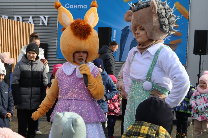 Для юных гостей ведущий подготовил игры на ловкость и скорость. Детвора с радостью соревновалась, а Ёжик и Белочка не давали скучать ни минуты.