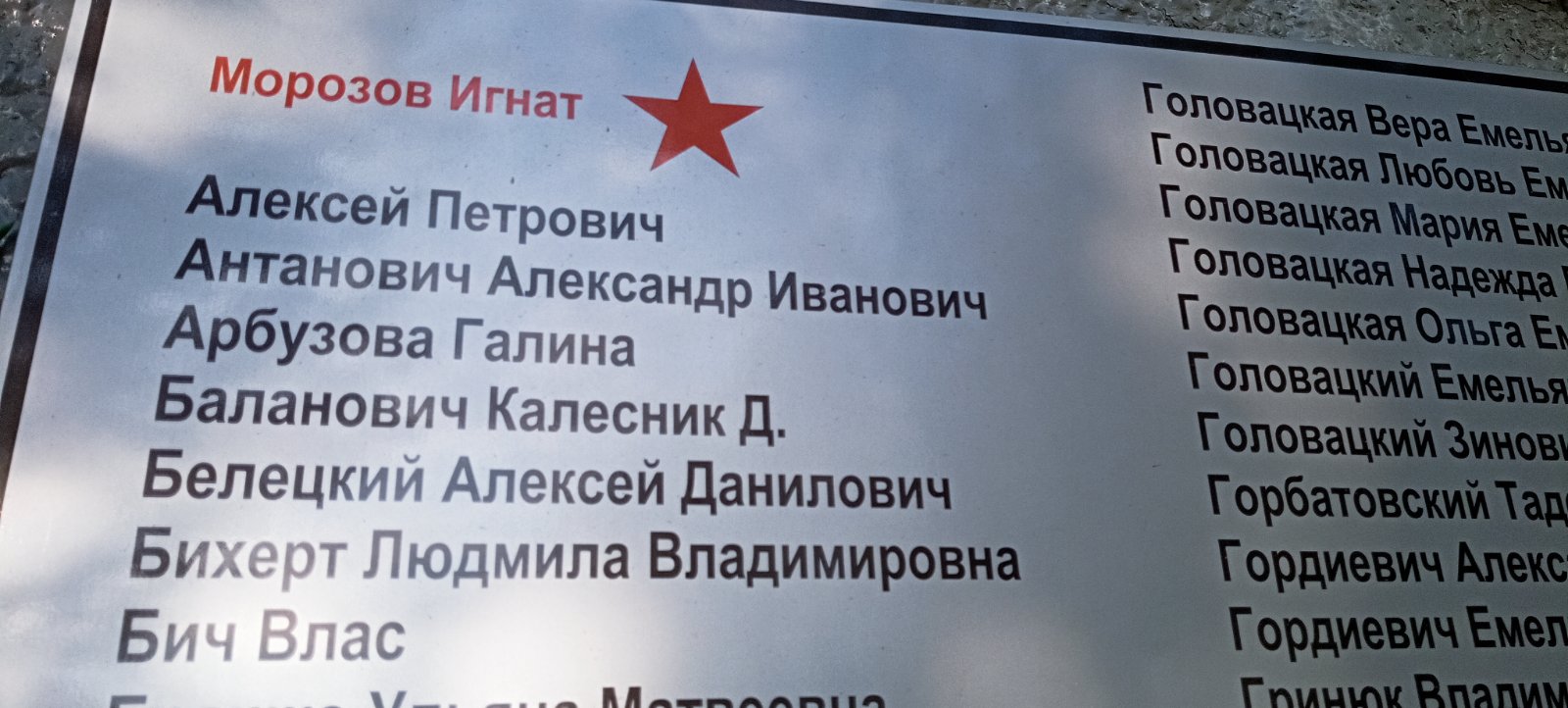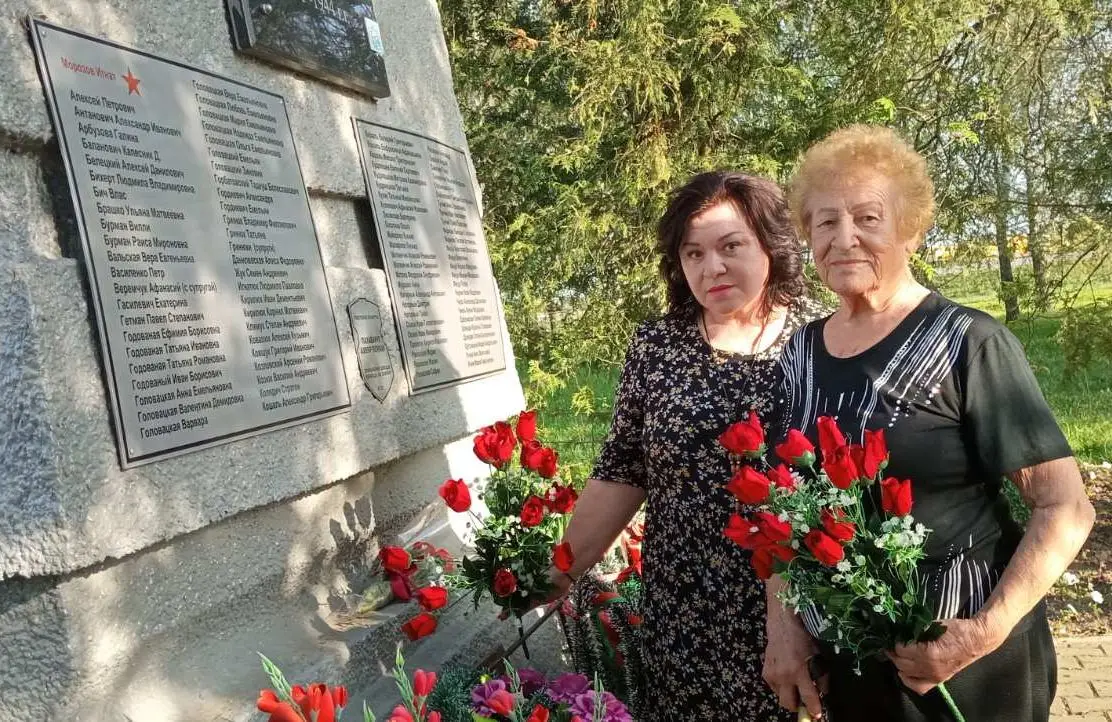 Накануне 80-й годовщины Победы Валентина Андреевна и Ангелина Николаевна возложили цветы к памятнику на ул. Первомайской и к обелиску в д. Черевачицы, где на мемориальной табличке в списке погибших уже значатся имена Власа Бича и Игната Морозова.