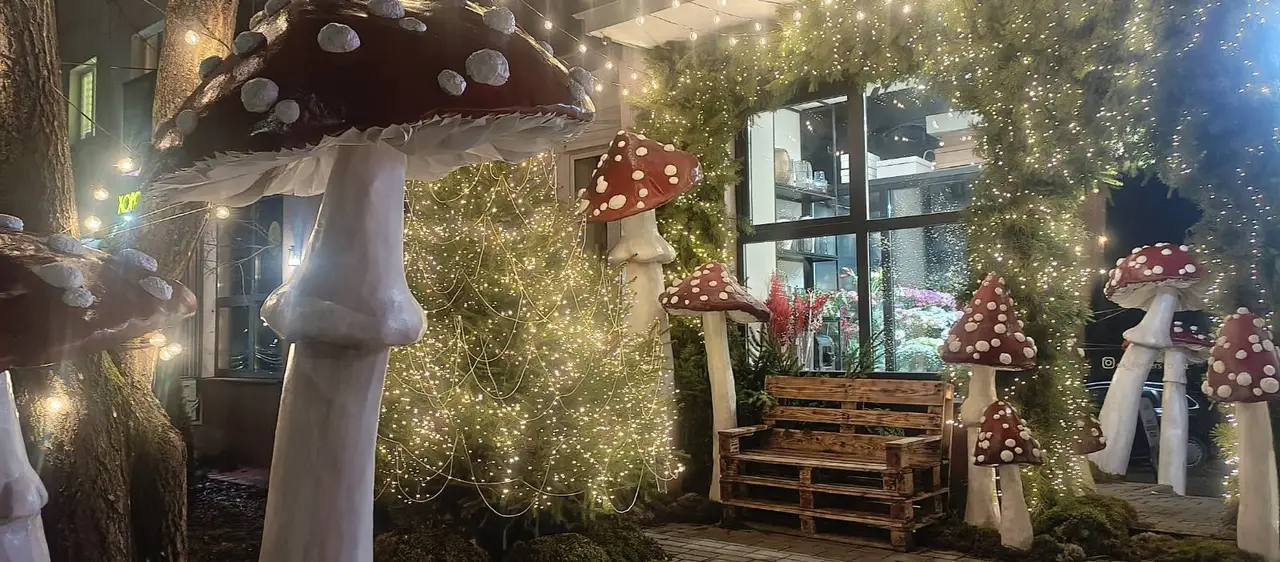 У кафе OKflowers на Набережной выросли гигантские мухоморы. Люди замирают напротив «природного» арт-объекта и задаются вопросом: к чему тут грибы? Не знаю, какой смысл в инсталляцию вкладывал автор этой работы, а по-нашему, она просто источник драйва и хорошего настроения. Повеселиться можно и притормозив у вывески «BAROCCO» на Советской. Как еще мог отметить Новый год магазин модной обуви и аксессуаров? У входа расположились две веселые елочки: на дамских ножках в красных туфельках-лабутенах они будто подсказывают сюжет настоящего пати. Как говорит поколение Z, «прикольно».