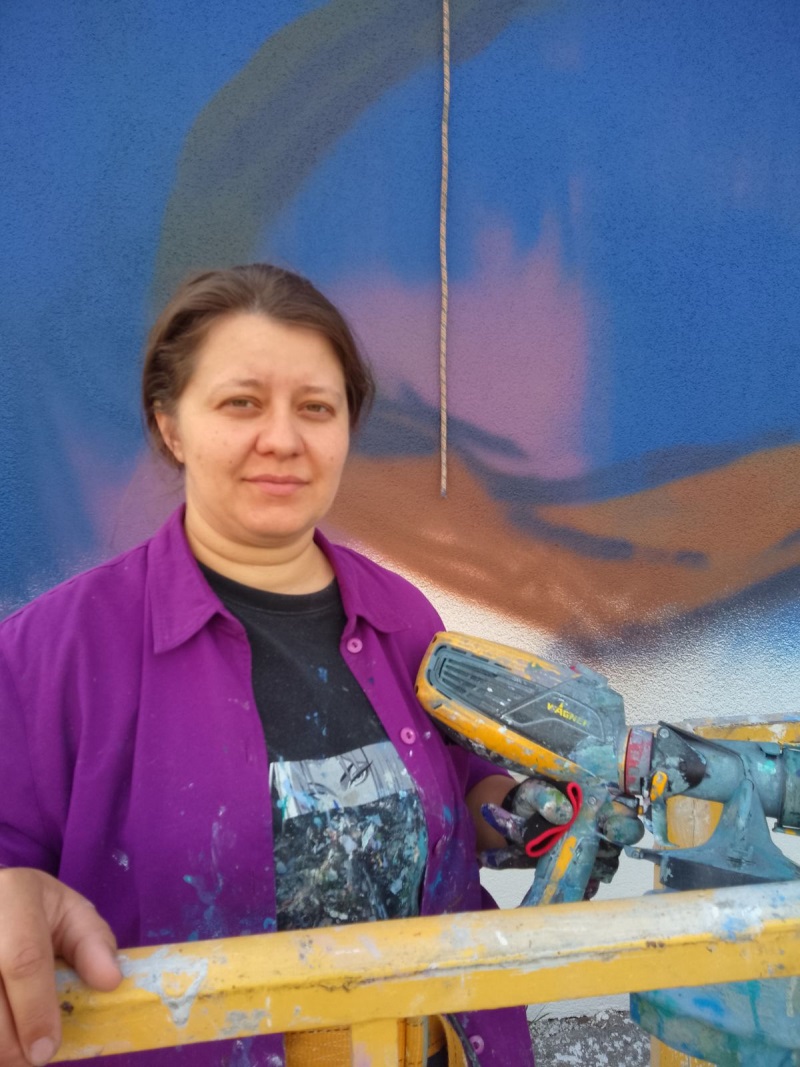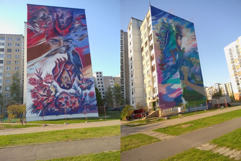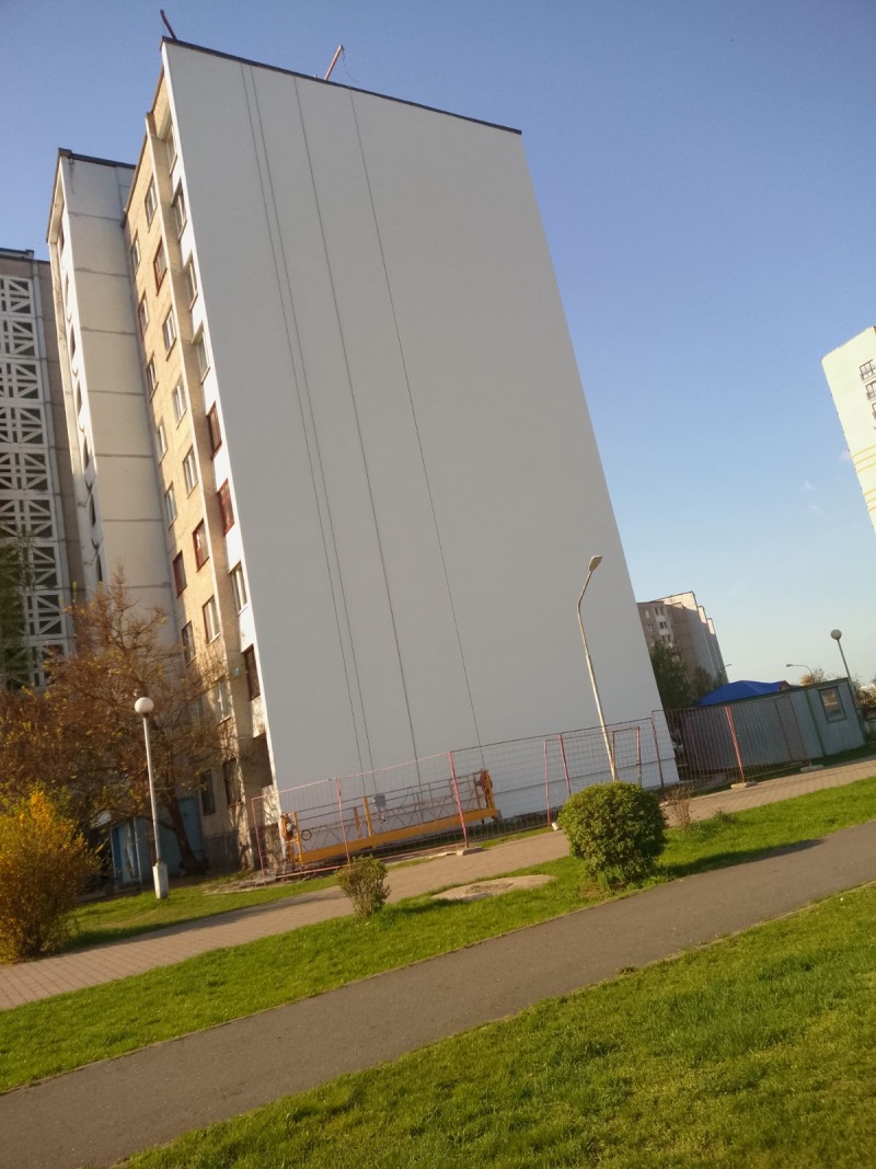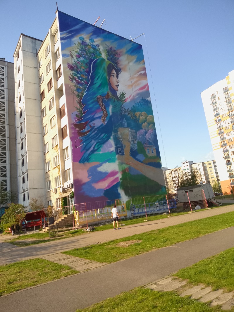 С наступление весеннего тепла мастера-строители и мастера изобразительного искусства приступили к обновлению внешнего вида трёх домов, своими «глухими» стенами как раз выходящими на эту важную городскую артерию в районе Гребного канала. После недавней аккуратной замены строителями покрытия своеобразного стенного «полотна», за дело взялась выпускница Брестского университета им. Пушкина, художник-педагог Анастасия Кошелюк. В одиночку поднимаясь в подвесной корзине на 27-метровую высоту, борясь с внезапными и ветром, и осадками, отважная молодая мама творит красоту для всех нас и на наших же глазах.