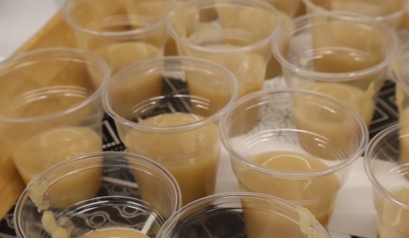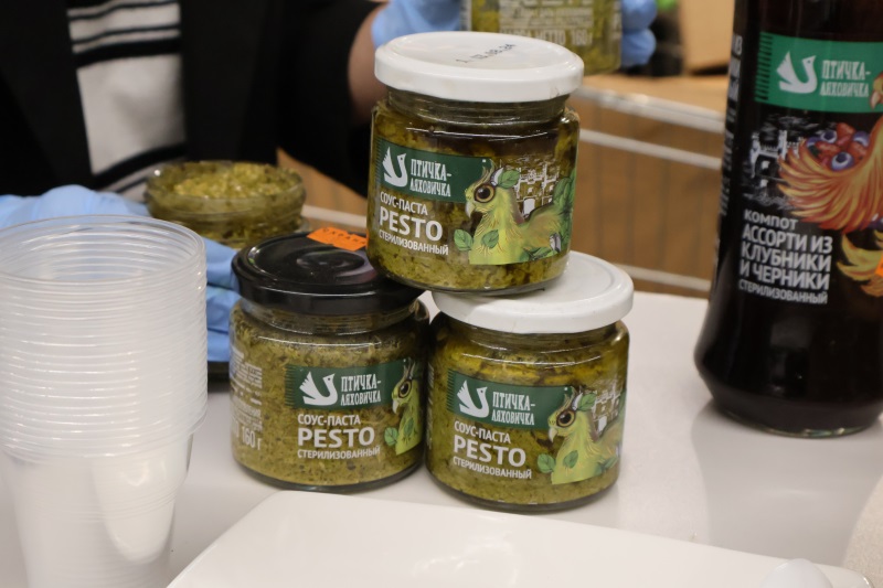 — На дегустацию в Брест мы привезли сок яблочный в трехлитровых банках, — рассказывает покупателям менеджер отдела маркетинга Анна. – Именно его очень охотно разбирают бюджетные организации (в том числе школы, детские сады, воинские части.) Привезли и новинку этого года — пюре яблочное с молоком и сахаром. Этот вид продукции пополнил линейку протертых яблок с сахаром и пюре с добавлением сорбита. Также представили соус песто. Его выпускаем уже три года. Базилик для его производства выращиваем и получаем по зарубежной технологии в собственном подсобном хозяйстве. Также в рецептуре используется сверхтвердый сыр, оливковое масло, кедровые орешки или кешью. Баночки с песто с насыщенного изумрудного цвета содержимым на полках магазинов не задерживаются. Ну а компоты, можно сказать, готовим по бабушкиным рецептам – с ягодами. Ассорти в бутылках под брендом «Птичка-Ляховичка» знакомы многим покупателям.