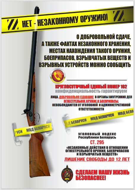 МИЛИЦИЯ НАПОМИНАЕТ! В соответствии с действующим законодательством добровольная выдача незарегистрированного огнестрельного (холодного) оружия, боеприпасов, взрывчатых веществ и взрывных устройств освобождает граждан от административной и уголовной ответственности!