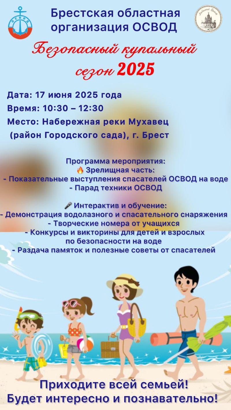 С 10:30 до 12:30 акция с названием «Безопасный купальный сезон 2025» пройдет в Бресте 17 июня на набережной Мухавца в районе Городского сада.