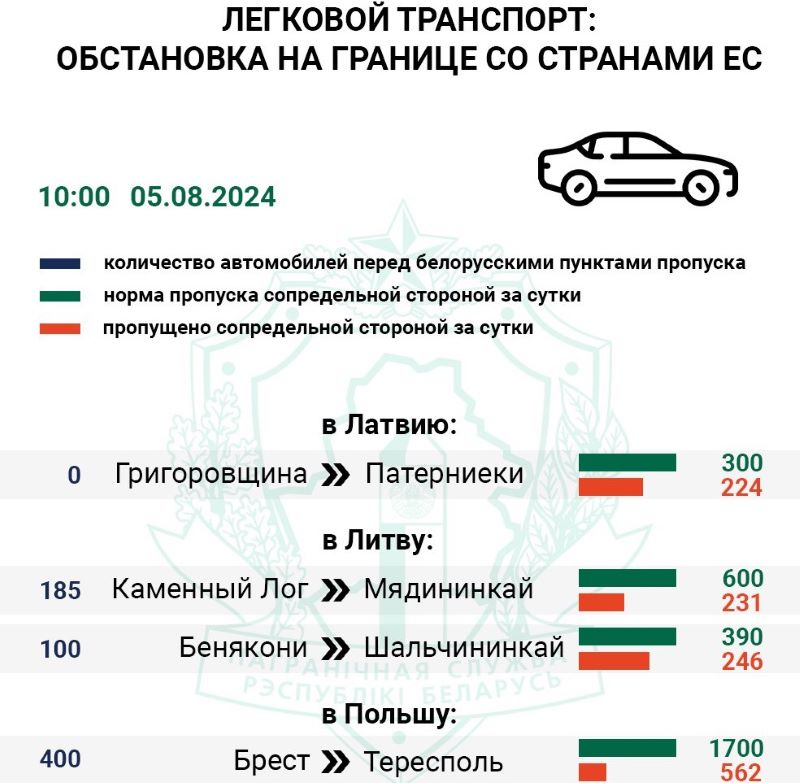 Перед литовскими погранпереходами Мядининкай (Каменный Лог) и Шальчининкай (Бенякони) скопилось 185 и 100 легковушек соответственно, их контрольные службы оформили 47% и 65% авто.