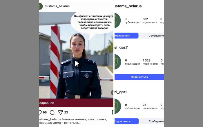 Привлекает взгляд «оригинальность» созданной с помощью ИИ рекламы в фейковом аккаунте под названием «customs_belarus», которая предлагает перейти на еще один такой же мошеннический канал «Беларусь» в мессенджере Telegram.