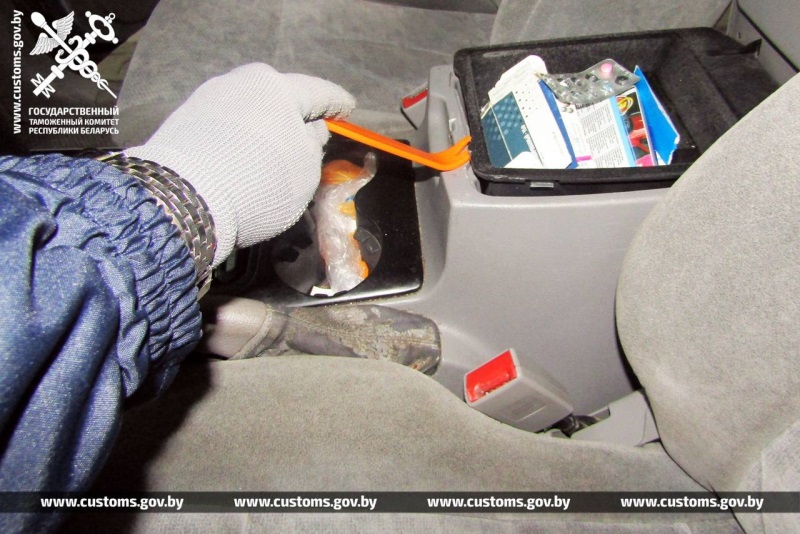 В результате обнаружены тайники с сокрытыми товарами — в подлокотнике между сидениями в одном авто, в нише за приборной панелью под рулевым колесом в другом.