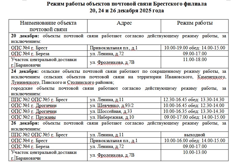 20, 24 и 26 декабря 2025 года городские и сельские отделения почтовой связи работают по установленному режиму работы.