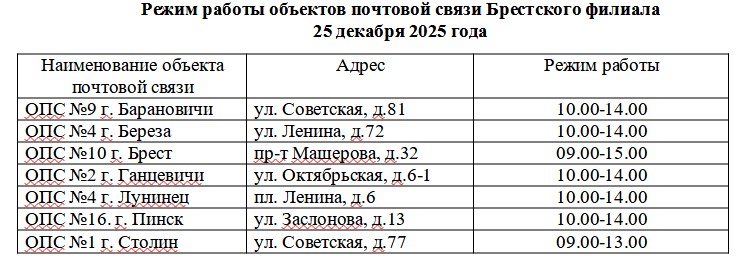 25 декабря 2025 года работают объекты почтовой связи, с перечнем которых можно ознакомиться здесь.