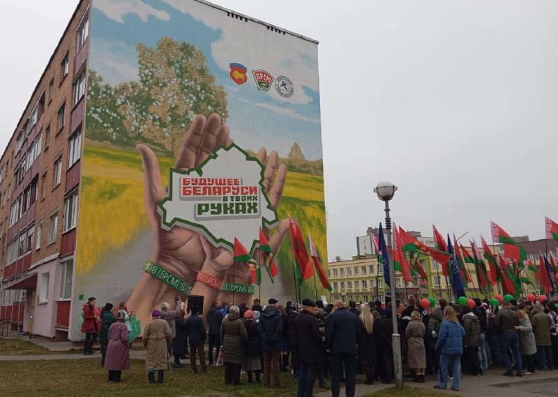 Второй день выдался еще более насыщенным разного рода встречами и событиями. На улице Брестской, 85, торжественно открыли мурал «Будущее Беларуси в твоих руках». Торец пятиэтажного многоквартирного жилого дома накануне украсила картина в виде контурного изображения карты Беларуси, которую крепко держат мужская, женская и детская руки. В центре карты слова Президента страны А.Г.Лукашенко, адресованные молодежи.