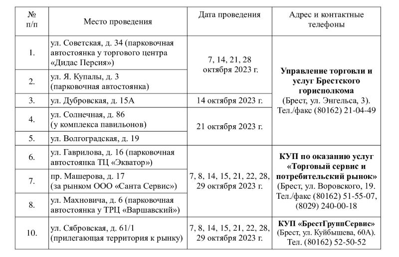 Информация о проведении ярмарок размещена на сайте горисполкома. Уточняется, что привычное для горожан место проведения ярмарок на площадке по адресу: г. Брест ул. Московская, д. 273 А (парковочная автостоянка у здания филиала Белорусского республиканского унитарного страхового предприятия «Белгосстрах» по Брестской области) в этом сезоне использоваться не будет.