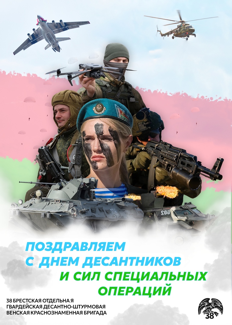 Примите поздравления с Днём десантников и сил специальных операций Вооруженных сил от всего личного состава 38 десантно-штурмовой бригады. За мужество и доблесть, патриотизм и бесстрашие, умение свято хранить воинское братство и побеждать в самых сложных условиях воины-десантники снискали заслуженную любовь и уважение народа.