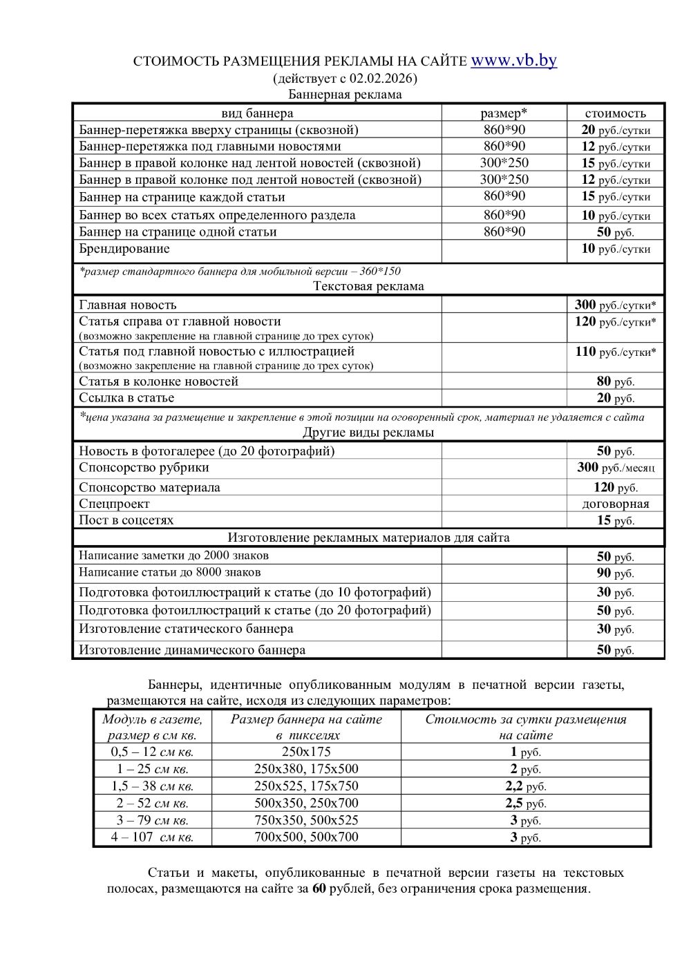 Новостная заметка о событии, акции. 60 рублей (+50 рублей за фиксированное место в течение суток и более).