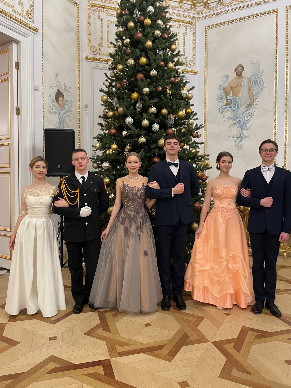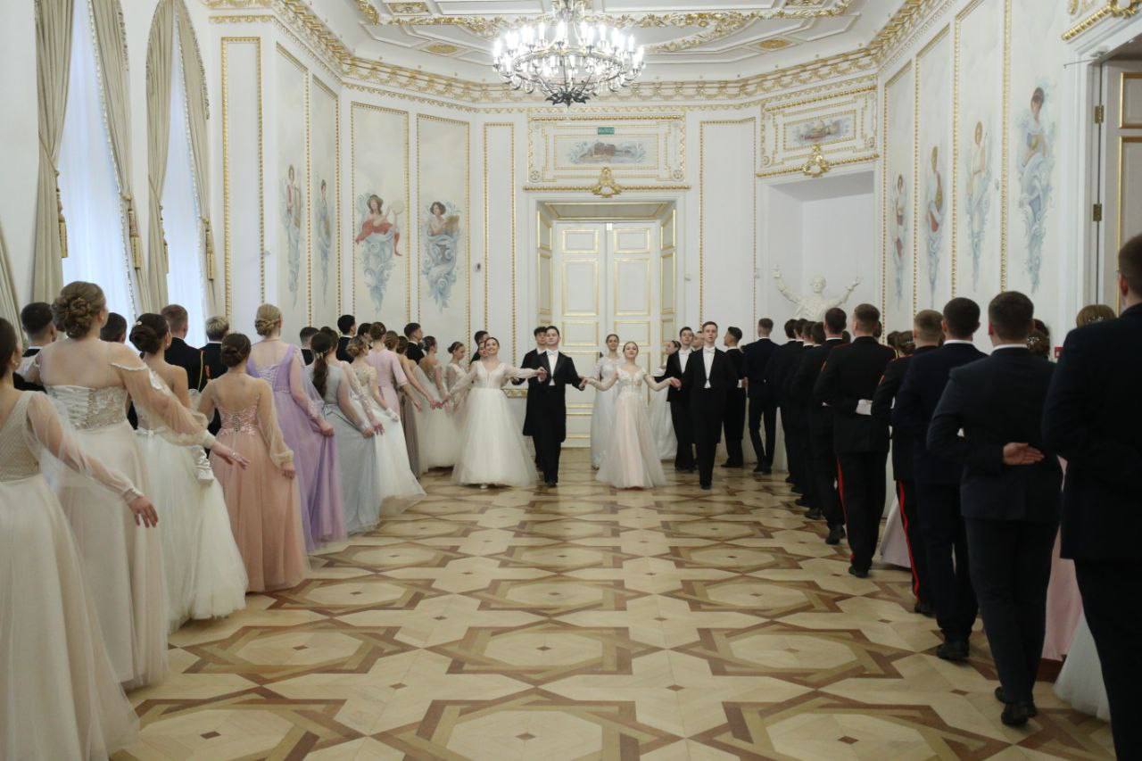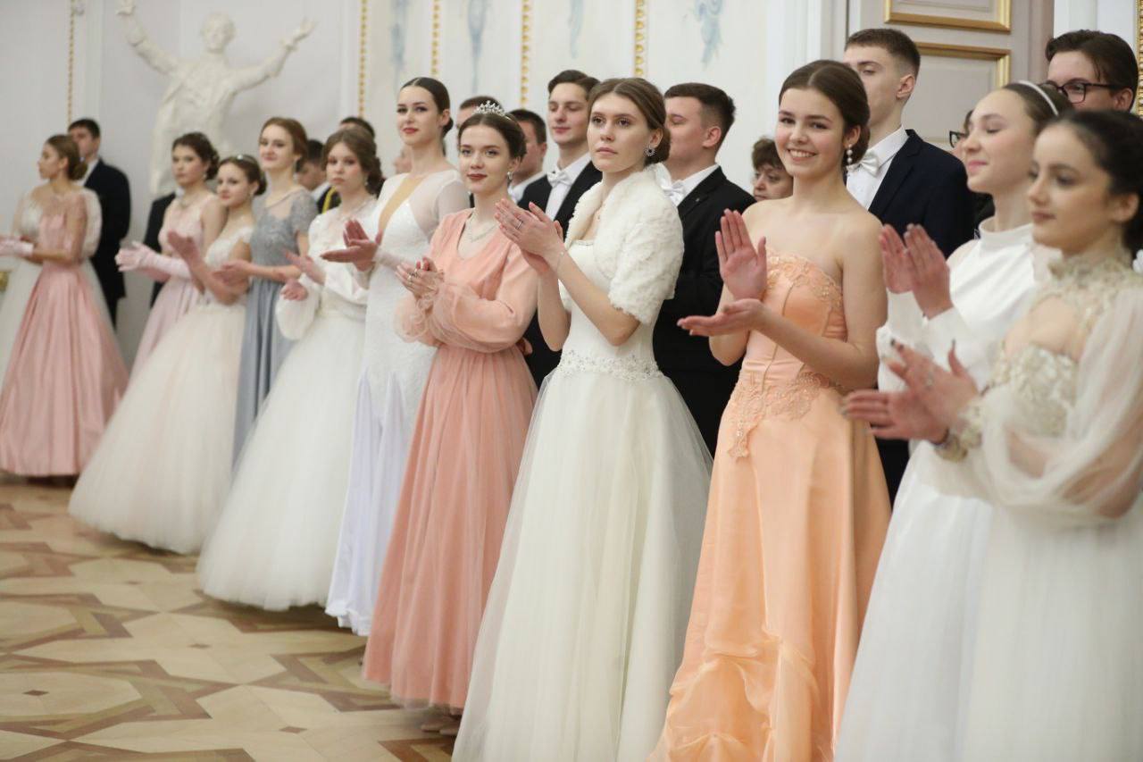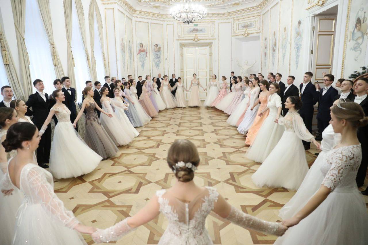 В Белом зале дворца царила атмосфера изысканности и благородства. Девушки в роскошных вечерних платьях, юноши – в элегантных костюмах под музыку оркестра, исполнявшего композиции XIX века, танцевали полонез, вальс, польку, кадриль и другие танцы.