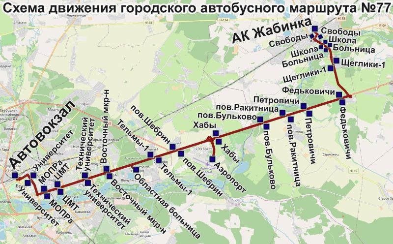В связи с организацией с 3 апреля авиарейсов «Москва — Брест – Москва» на городском автобусном маршруте №77 «АВ Брест – АК Жабинка» по средам и субботам вводятся заезды в аэропорт «Брест» (в прямом и обратном направлении).