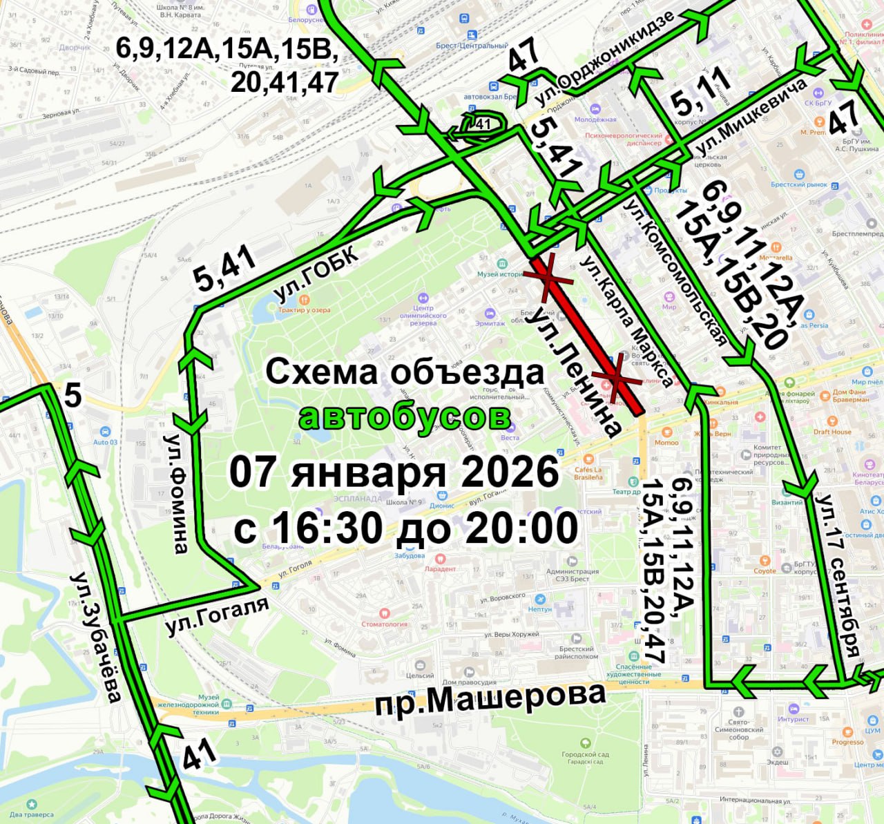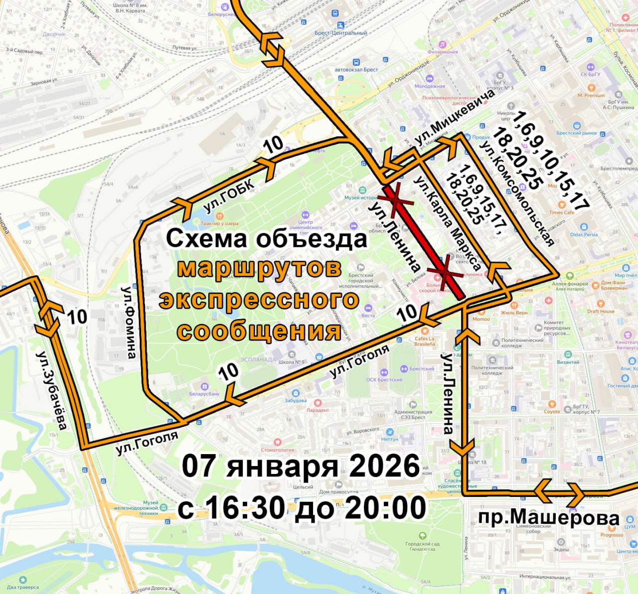В связи с проведением массовых мероприятий 7 января 2026 года вводится временное запрещение движения транспортных средств и самоходных машин по ул. Ленина на участке дороги от ул. Мицкевича до ул. Гоголя с 16 часов 30 минут до 20 часов 00 минут.