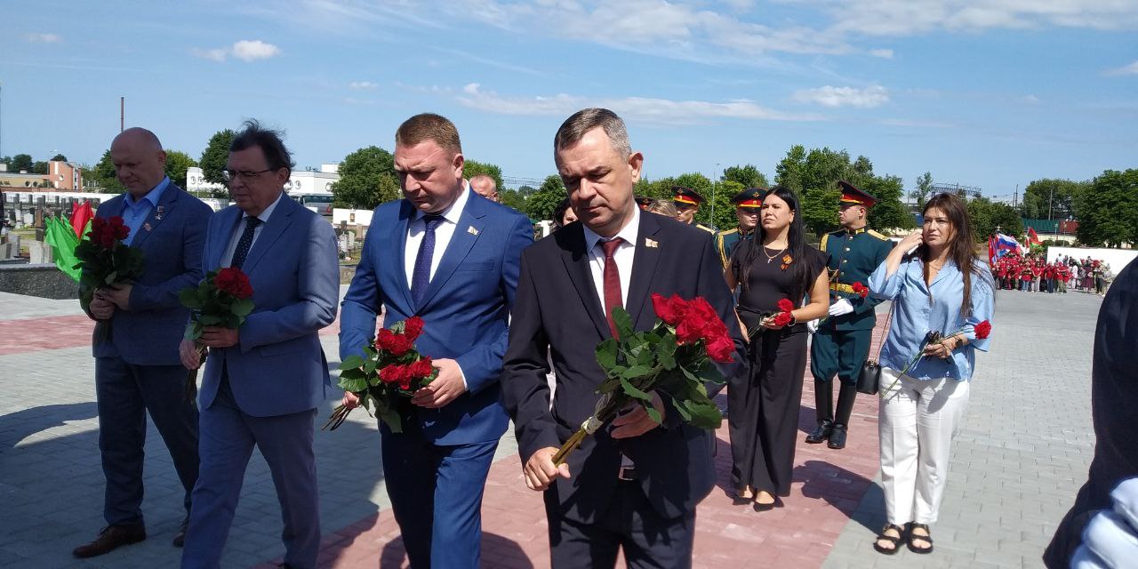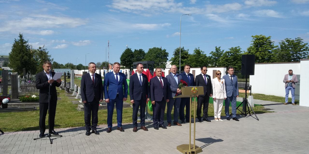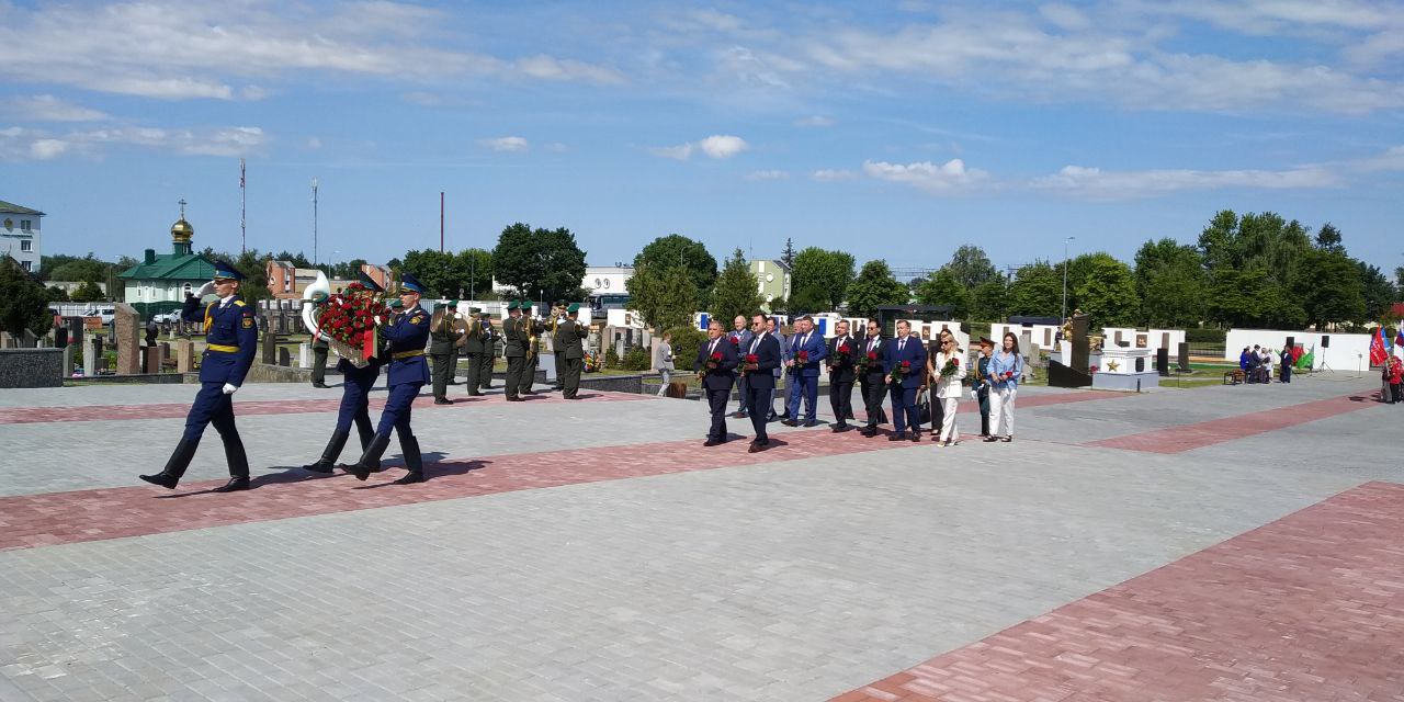 Председатель Брестского горисполкома Сергей Лободинский, Генеральный консул Республики Казахстан в Бресте Максат Ибраев, Генеральный консул РФ в Бресте Олег Мурашев, Герой России, летчик-космонавт и депутат Московской городской Думы Олег Артемьев, вице-губернатор Пензенской области Сергей Федотов, заместитель председателя Правительства Удмуртской Республики Наталья Тойкина почтили память погибших возложением цветов к мемориальным плитам на Алее памяти, которая была создана на Гарнизонном кладбище в 2024 году для увековечивания памяти погибших в годы Великой Отечественной войны на территории Беларуси.