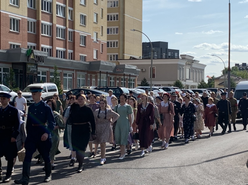 Замыкают шествие девушки, одетые по моде 1941 года. Они примут участие в ретро-программе «Последний мирный день» на ул. Советской.