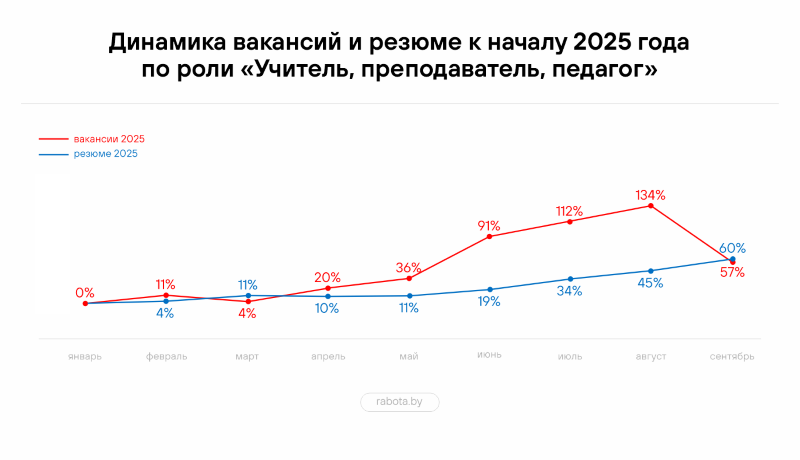Количество активных резюме и вакансий для преподавателей, размещенных на rabota.by, по сравнению с началом 2025 года, выросло более, чем в 1,5 раза. При этом активность соискателей увеличивалась с января по сентябрь постепенно и плавно. К концу первого осеннего месяца прирост резюме к началу года составил 57%.