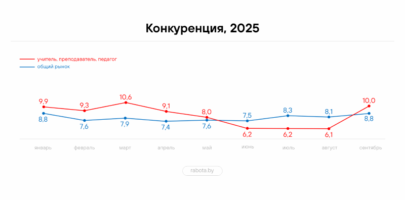 При этом с января по апрель 2025 года индекс rabota.by для роли «Учитель, преподаватель, педагог» был выше, чем в целом по рынку (9,1−10,6). Летом конкуренция за рабочие места среди учителей снизилась в связи с увеличением числа вакансий. Индекс rabota.by по профроли «Учитель, преподаватель, педагог» в этот период снизился до 6,2, но в первый месяц осени снова превысил значение по рынку в общем — 10,0.