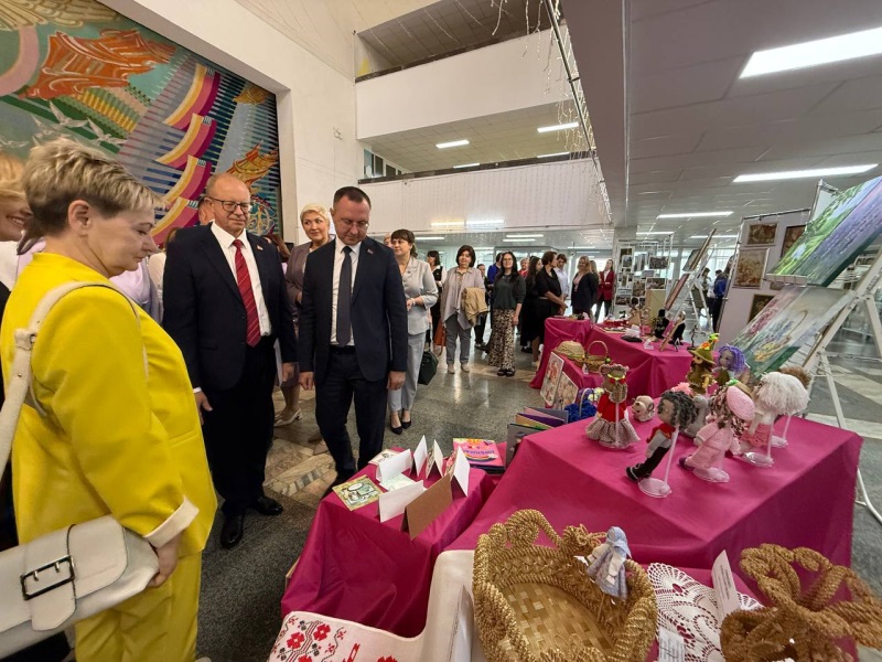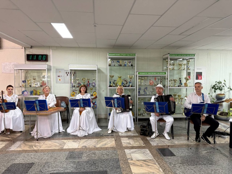 В холле ЦМТ организована выставка творческих работ педагогов. Музыкальное сопровождение создают оркестры гимназий №3 и №4.