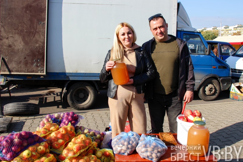 Артем Качина из Кобринского района наоборот сбывает свою продукцию. И ему это нравится. Как бонус для горожан – морковка по 70 копеек. Он ее высыпает прямо из мешка, выбирайте. «Раненую» за время перевозки отбрасывает. Видно, что корнеплоды сочные и красивые. Правда, урожай лука критикует (продает по рублю за кг). Мол, был дождливый сентябрь, и лук подмок. Хотя для ярмарки удалось выбрать сухой, который будет хорошо храниться. Арендует 7 гектаров земли. Начинал с раннего картофеля, затем расширил владения и ассортимент. Привез сорта «Королева Анна» и «Скарб» (по 70 копеек за кг). Имеет весь набор техники для посадки и обработки, картофелеуборочный комбайн. Так что «тяжело остановиться», как говорит сам. Объединились с товарищем и его семьей. Теперь нужно зарабатывать в два раза больше, ведь «жизнь дорожает».