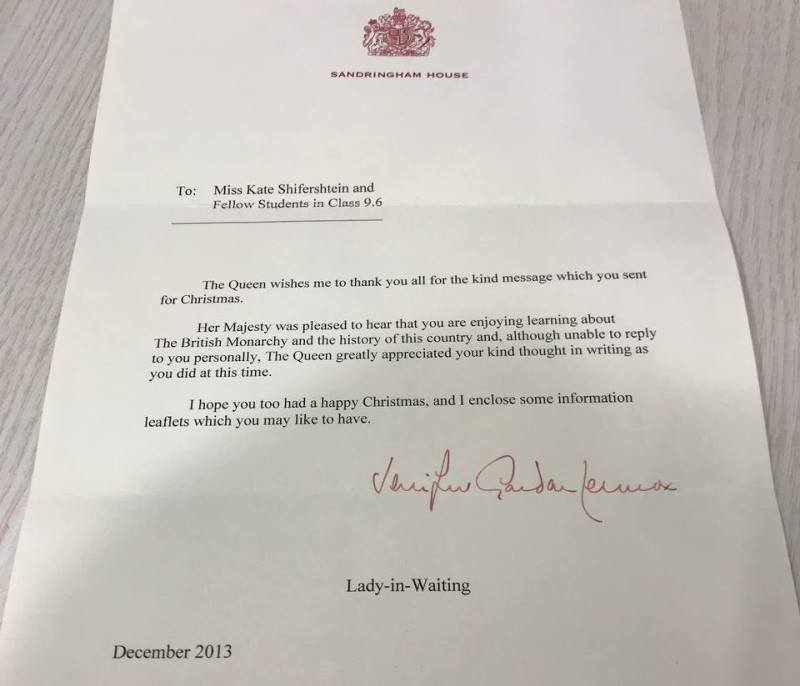 «Когда приехала, первым делом взяла письмо с собой в школу, и мы открыли его вместе с классом, – рассказывает брестчанка. – Там было послание на крафтовой бумаге, в котором королева передавала слова благодарности мне и нашему 9 «Г» классу за рождественские поздравления. Подпись Ее Величества была не факсимильной, а настоящей: это хорошо проявилось через пару лет, когда чернила от ручки немного выцвели. К письму был приложен буклет о королеве, различная информация о королевской семье и дворце. И даже написали, что нас ждут в гости».