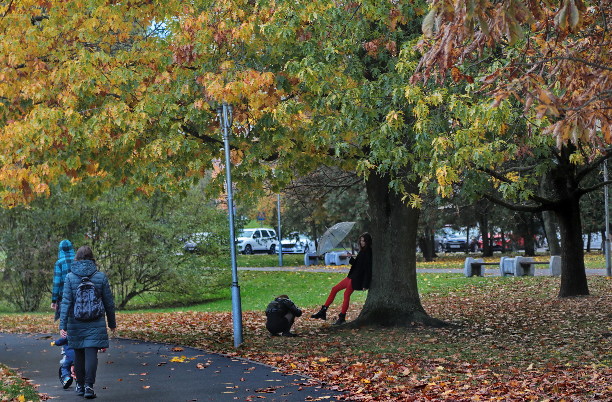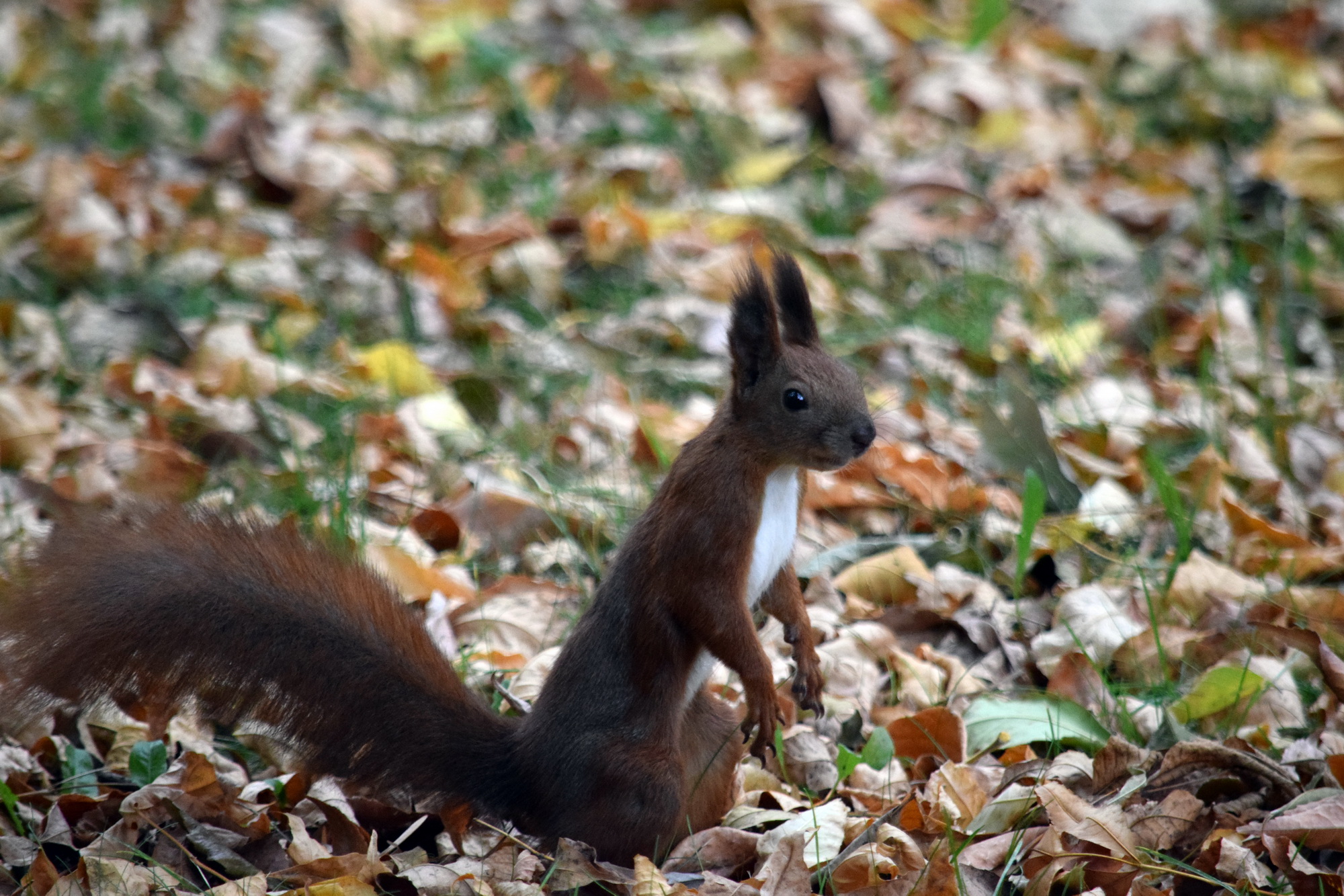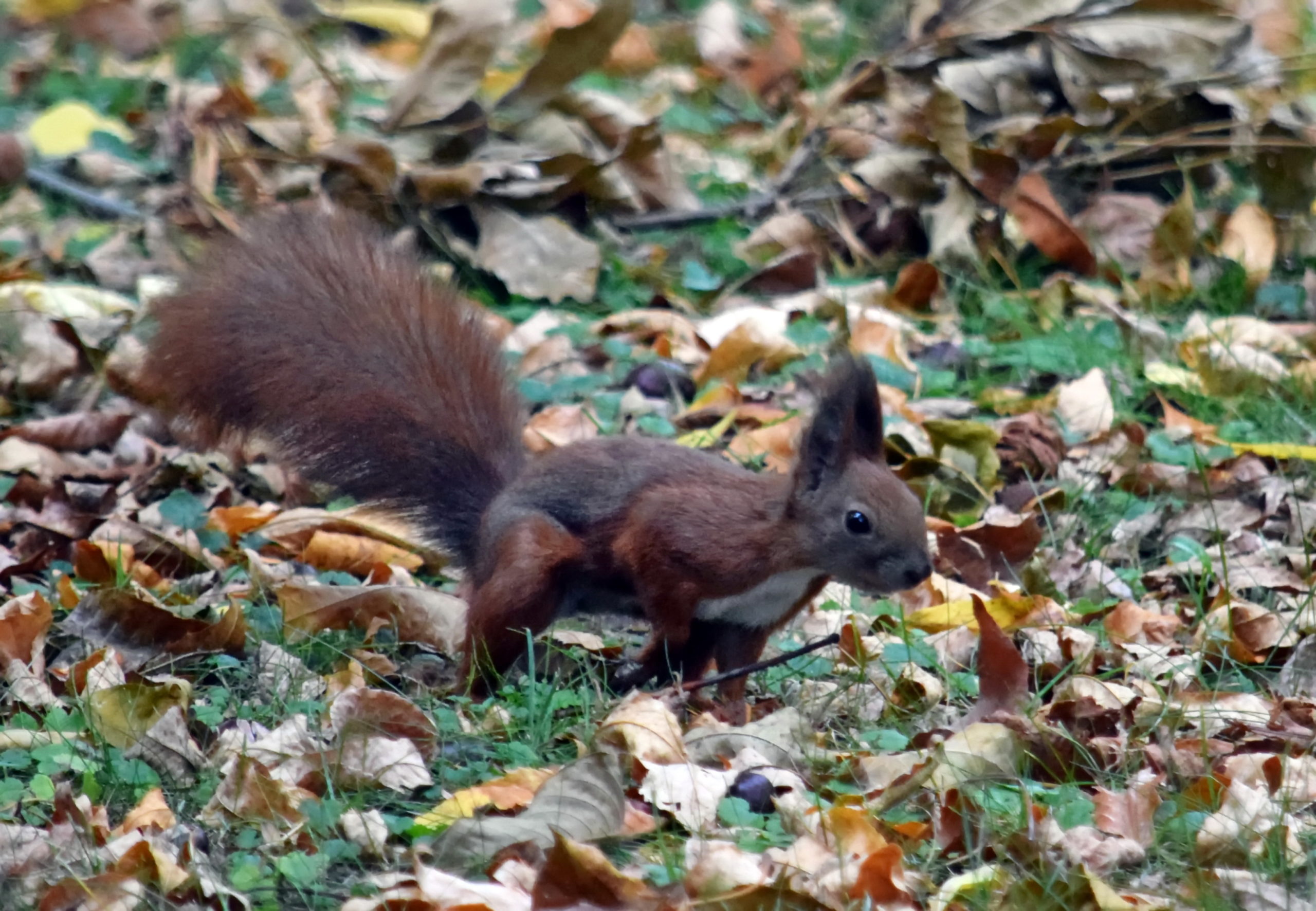 Пока добрался до парка, небо затянули облака. Фотографировать жёлтые и багряные деревья расхотелось. Зато встретил доверчивую белочку, зверёк прекрасно попозировал.