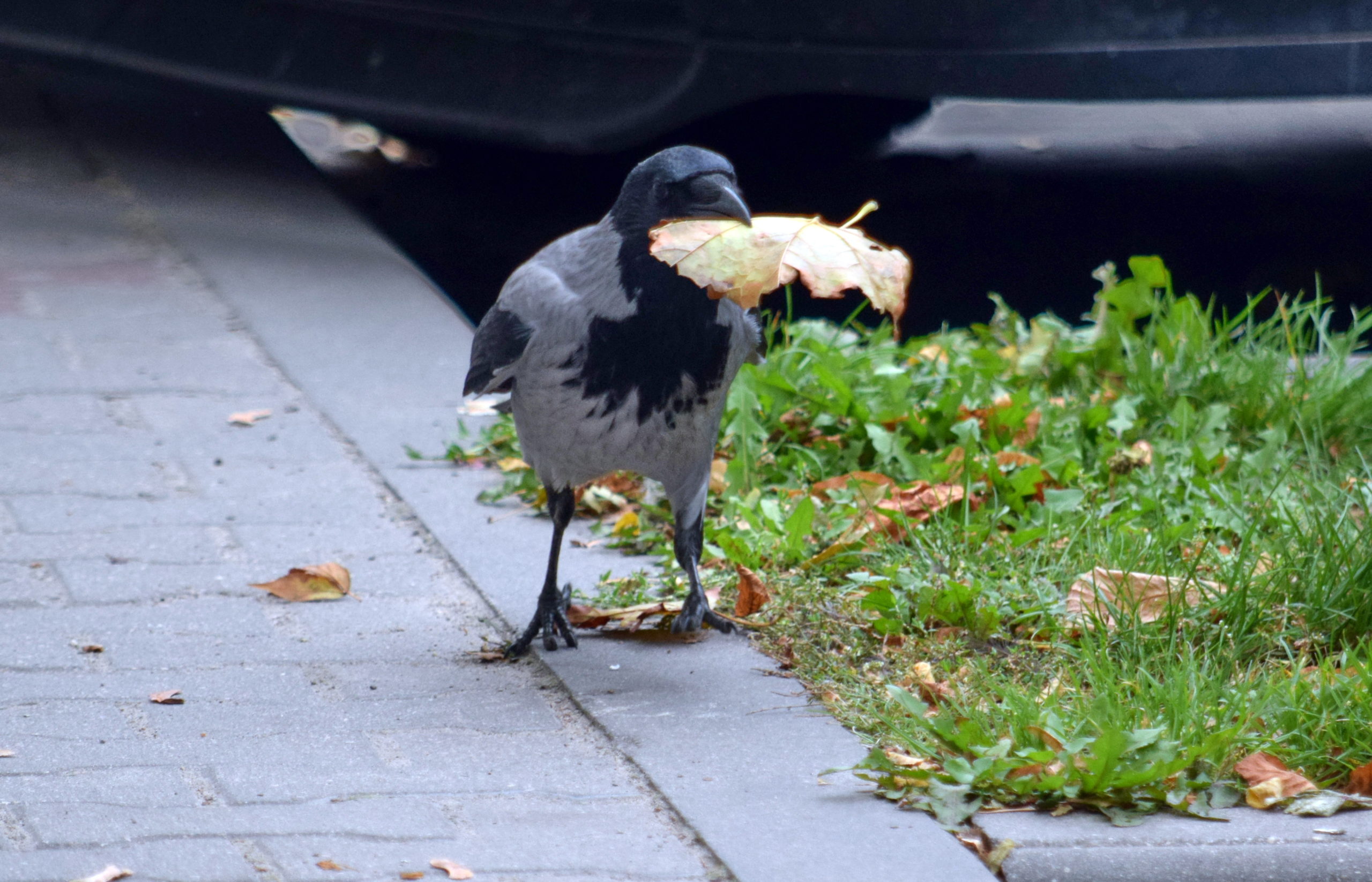 Также пересёкся с вороной, которая собиралась на капоте легковушки колоть орех. Завидев фотоаппарат, умная птица куда-то заныкала орех. Вместо него взяла в клюв сухой листик, типа, у меня ничего съедобного нет.