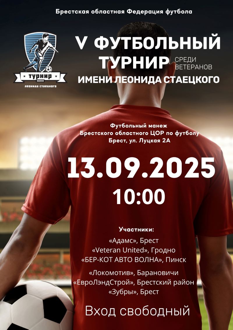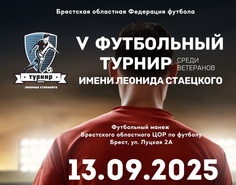 В манеже Брестского областного ЦОР по футболу (Брест, ул. Луцкая 2А) 13 сентября в 10:00 начнется V футбольный турнир среди ветеранов имени Леонида Стаецкого.