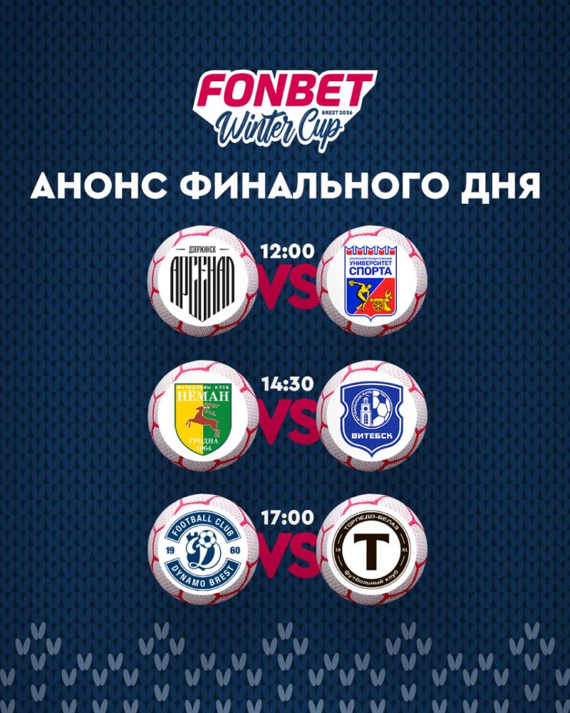В Брестском футбольном манеже пройдут решающие матчи турнира: в 12:00 «Арсенал» и «Университет спорта» сыграют за 5-е место, в 14:30 «Неман» и «Витебск» определят бронзового призёра, а в 17:00 стартует финал между «Динамо-Брест» и «Торпедо-БелАЗ».